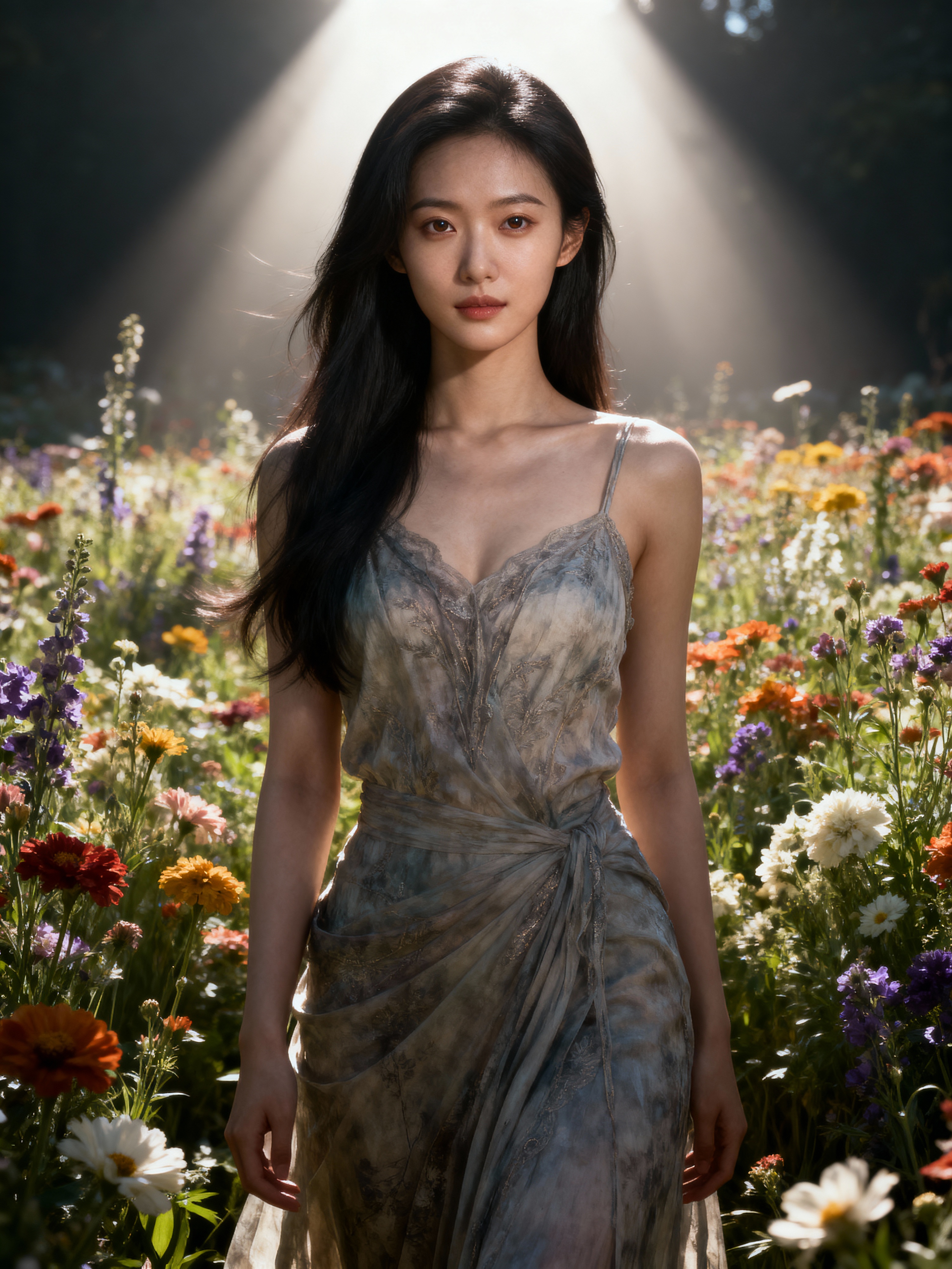 model | standing in field full of flowers | detailed gorgeous face! ! | full body! ! | god rays | intricate | elegant | realistic | hyperrealistic | cinematic | character design | concept art | illustration | digital art | digital painting | depth of field