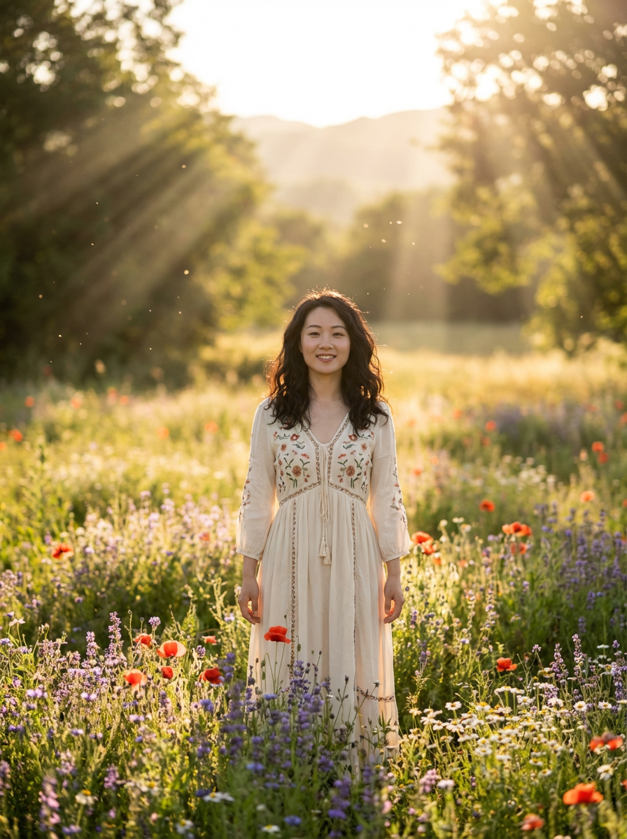 model | standing in field full of flowers | detailed gorgeous face! ! | full body! ! | god rays | intricate | elegant | realistic | hyperrealistic | cinematic | character design | concept art | illustration | digital art | digital painting | depth of field