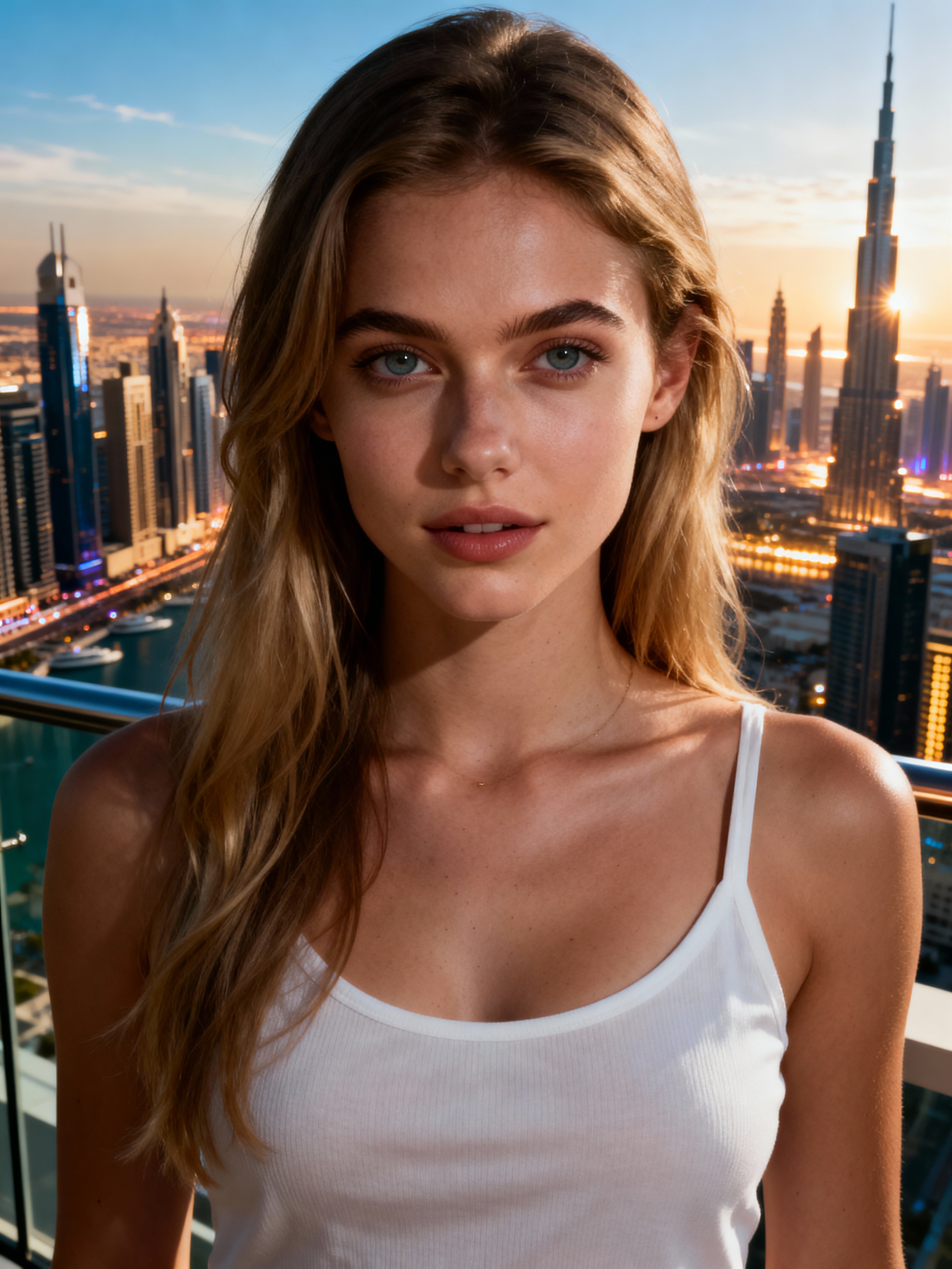 model standing in front of city skyline viewpoint in Dubai with city skyline in background