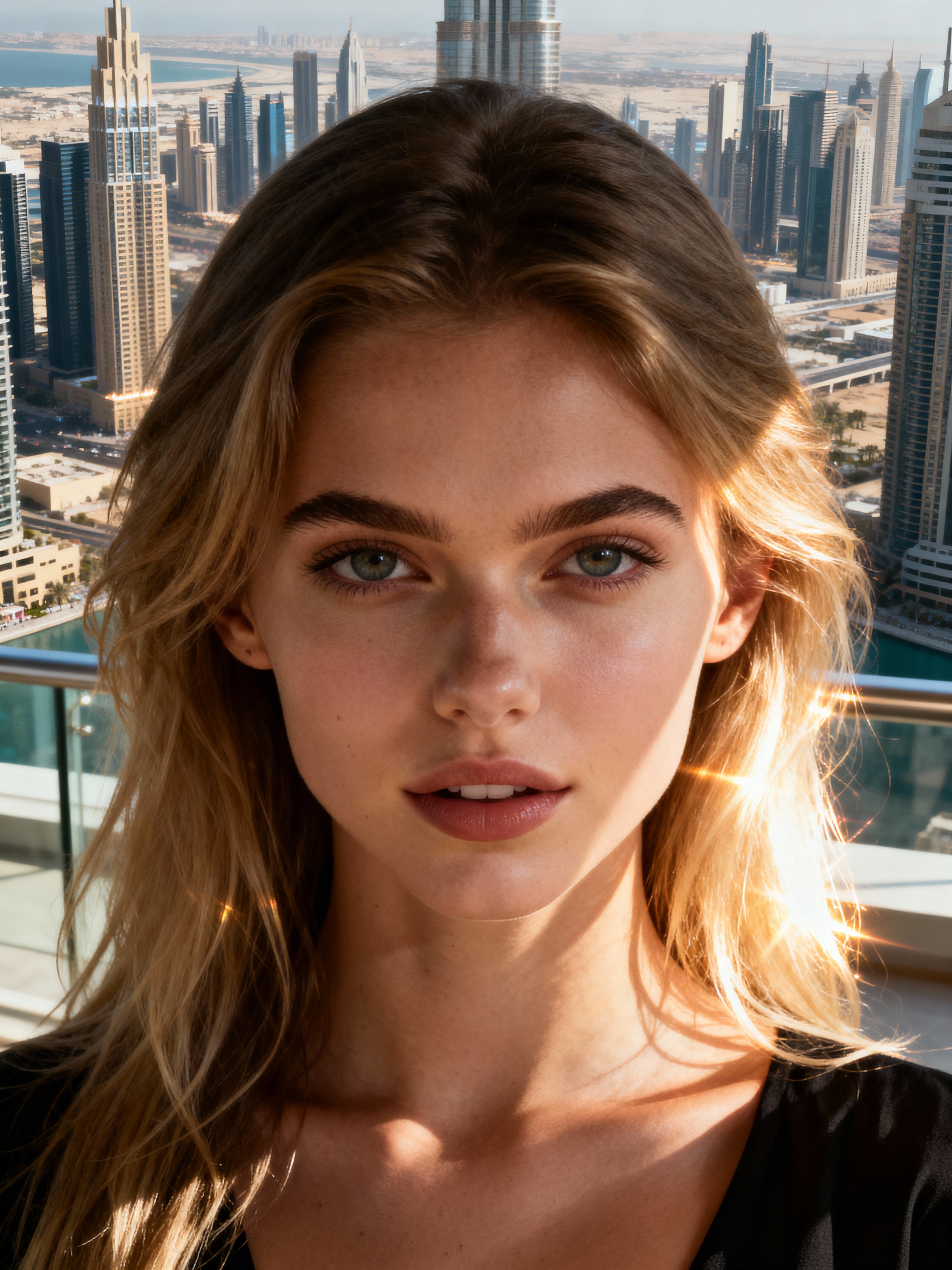 model standing in front of city skyline viewpoint in Dubai with city skyline in background