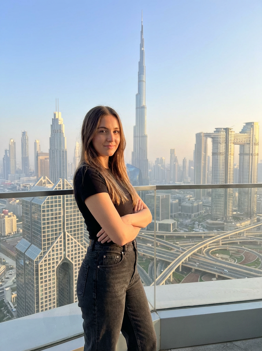 model standing in front of city skyline viewpoint in Dubai with city skyline in background