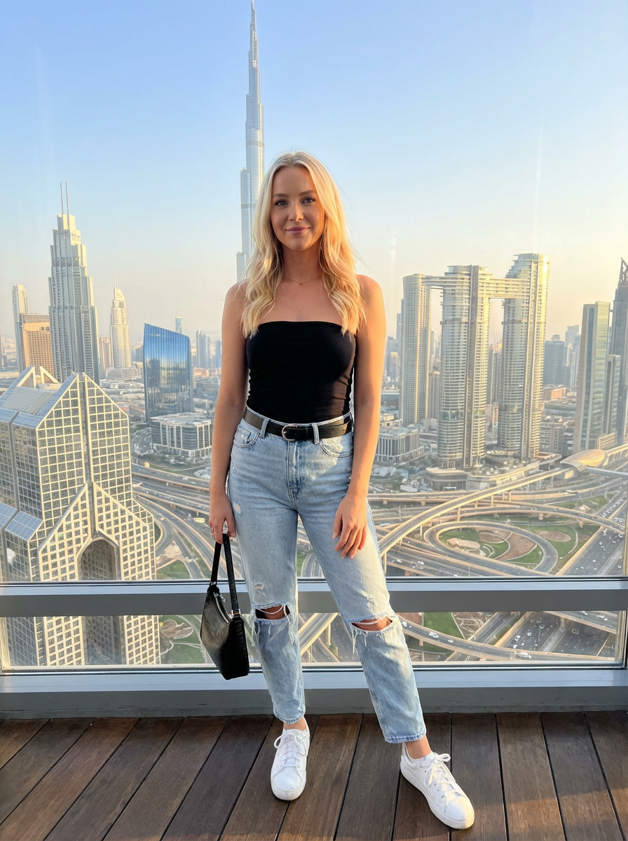 model standing in front of city skyline viewpoint in Dubai with city skyline in background