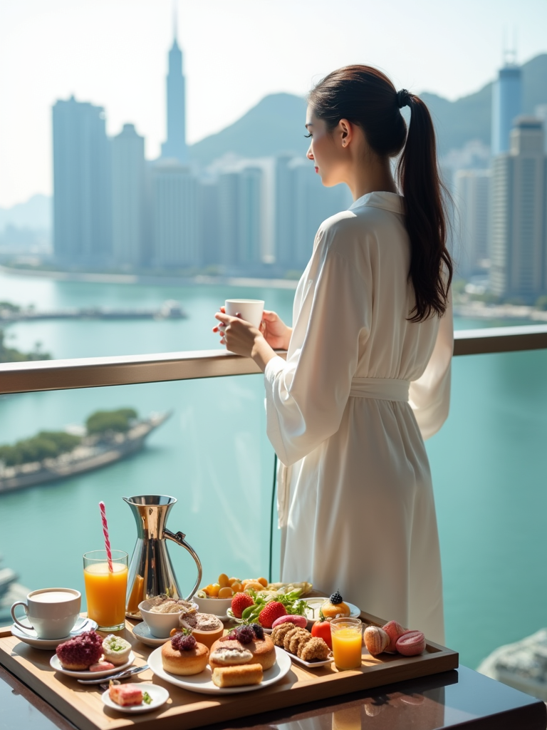 model standing on a luxurious balcony, overlooking a vibrant marina and modern skyscrapers. The model is wearing a white robe with their hair styled in a ponytail , holding a coffee cup in one hand. A lavish breakfast tray with fresh pastries, colorful fruits, macarons, and beverages is elegantly set on a table in the foreground. The atmosphere is serene, with soft daylight enhancing the opulent cityscape and indulgent setting