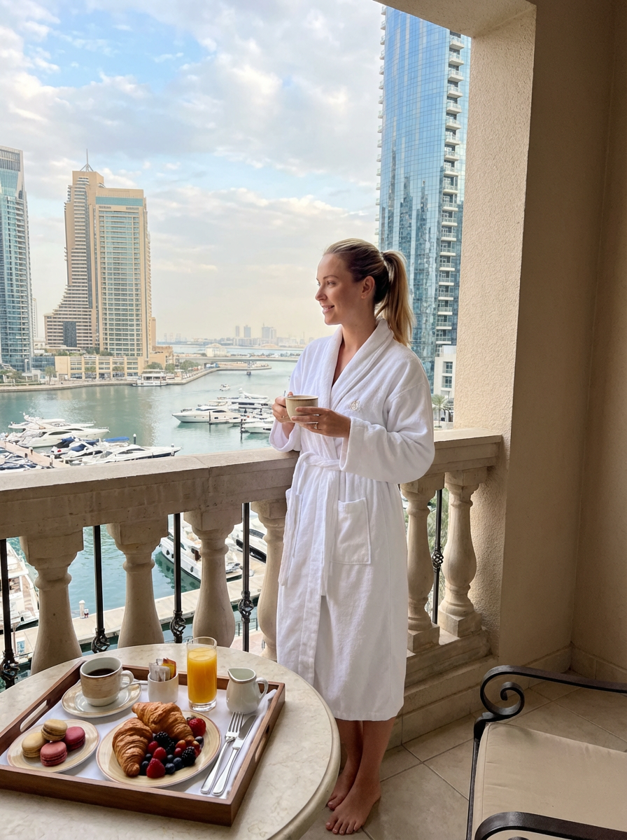 model standing on a luxurious balcony, overlooking a vibrant marina and modern skyscrapers. The model is wearing a white robe with their hair styled in a ponytail , holding a coffee cup in one hand. A lavish breakfast tray with fresh pastries, colorful fruits, macarons, and beverages is elegantly set on a table in the foreground. The atmosphere is serene, with soft daylight enhancing the opulent cityscape and indulgent setting