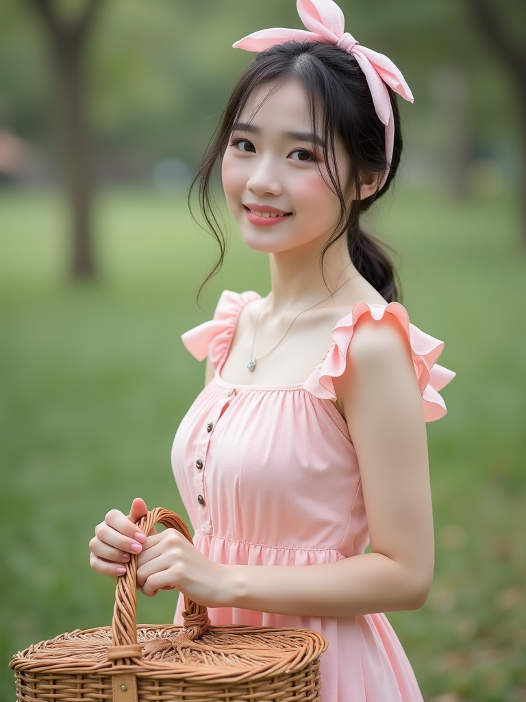 model standing with a picnic basket in hand, wearing a pastel pink sundress with a bow headband , natural background, styled like a vintage birthday postcard