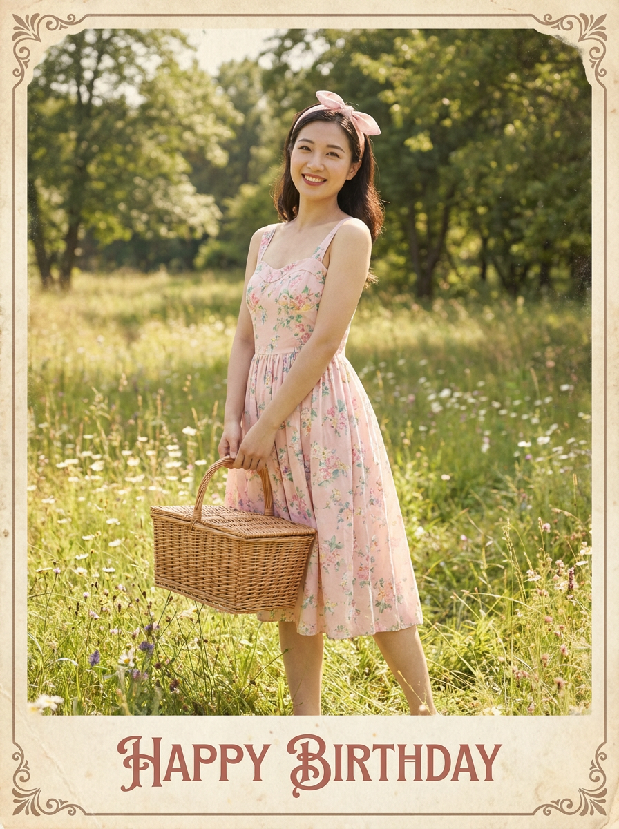 model standing with a picnic basket in hand, wearing a pastel pink sundress with a bow headband , natural background, styled like a vintage birthday postcard