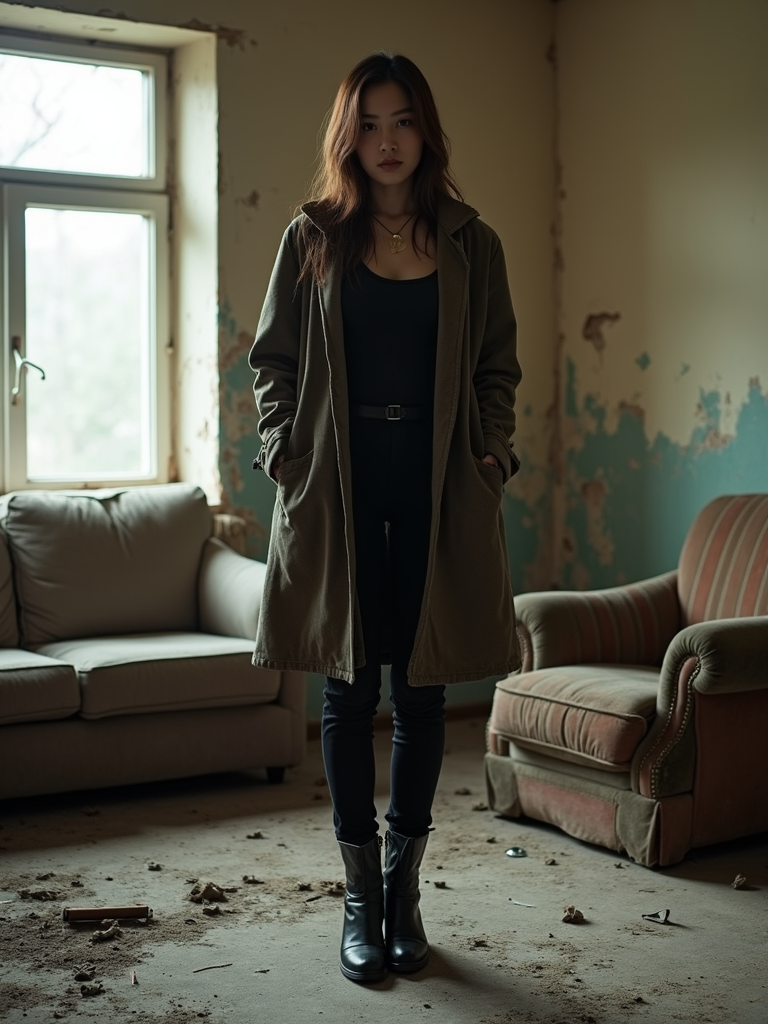 model stands in a decayed Soviet living room, worn furniture, peeling wallpaper, wearing a dusty coat, sunlight filtering through cracked windows. wearing black boots and black pants and black tank top.