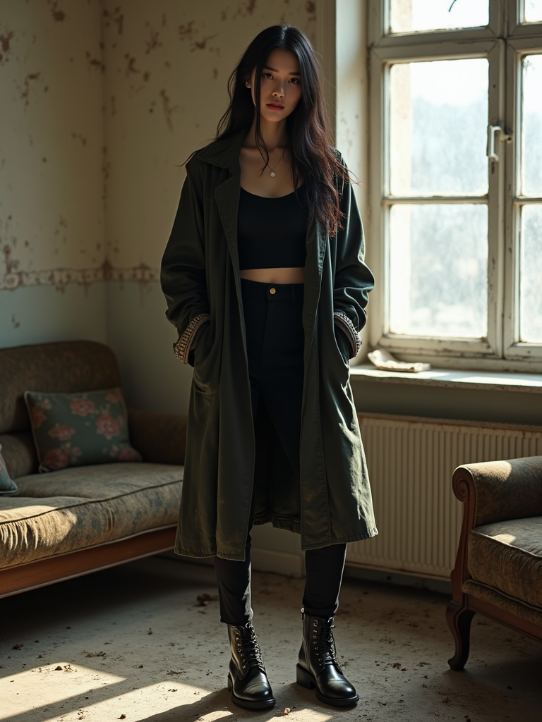 model stands in a decayed Soviet living room, worn furniture, peeling wallpaper, wearing a dusty coat, sunlight filtering through cracked windows. wearing black boots and black pants and black tank top.