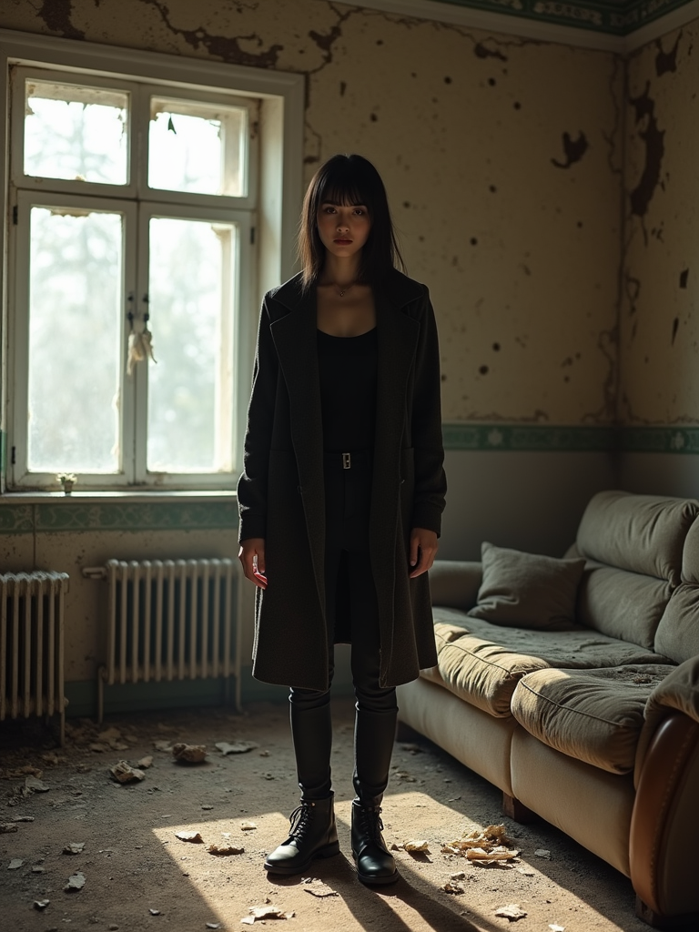 model stands in a decayed Soviet living room, worn furniture, peeling wallpaper, wearing a dusty coat, sunlight filtering through cracked windows. wearing black boots and black pants and black tank top.