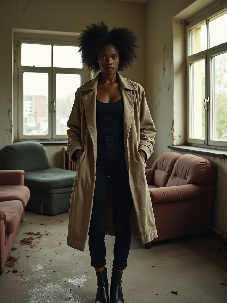 model stands in a decayed Soviet living room, worn furniture, peeling wallpaper, wearing a dusty coat, sunlight filtering through cracked windows. wearing black boots and black pants and black tank top.