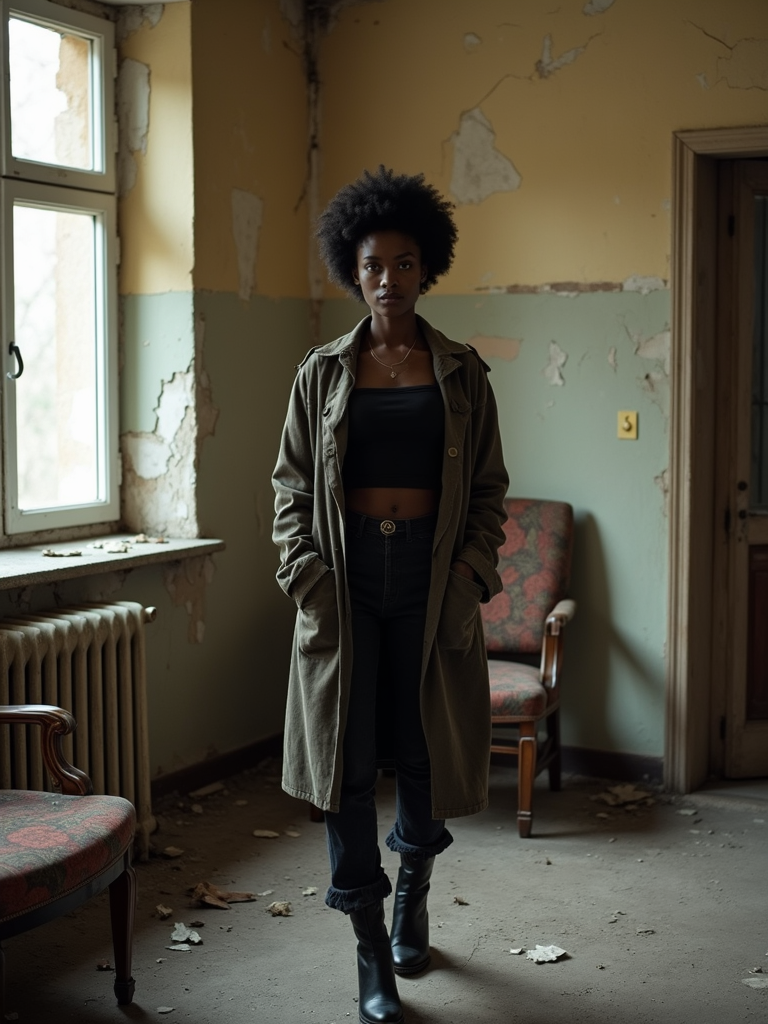 model stands in a decayed Soviet living room, worn furniture, peeling wallpaper, wearing a dusty coat, sunlight filtering through cracked windows. wearing black boots and black pants and black tank top.