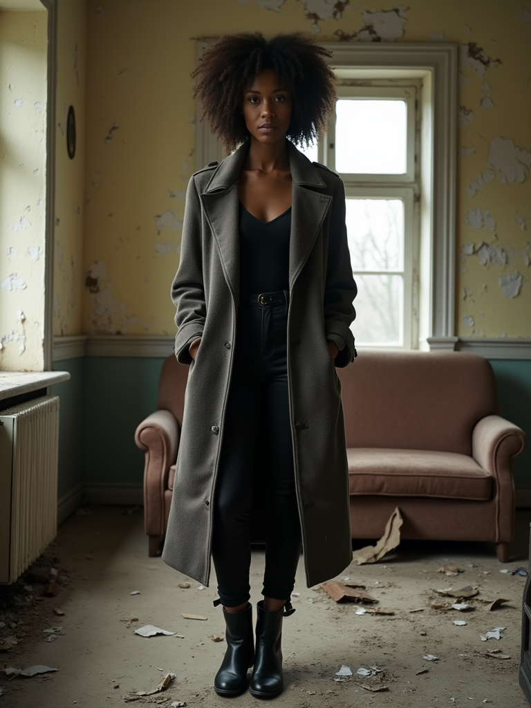 model stands in a decayed Soviet living room, worn furniture, peeling wallpaper, wearing a dusty coat, sunlight filtering through cracked windows. wearing black boots and black pants and black tank top.