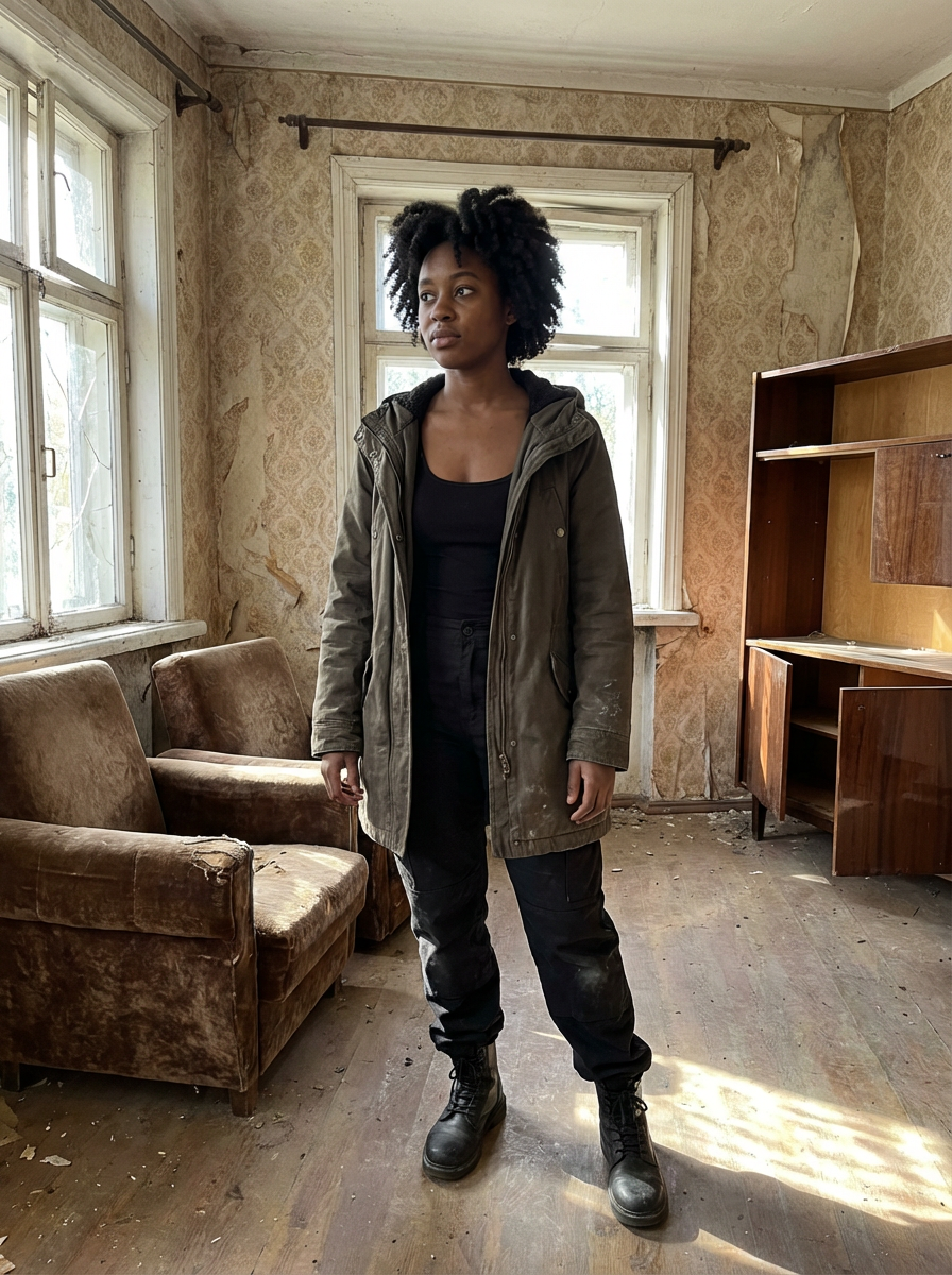 model stands in a decayed Soviet living room, worn furniture, peeling wallpaper, wearing a dusty coat, sunlight filtering through cracked windows. wearing black boots and black pants and black tank top.