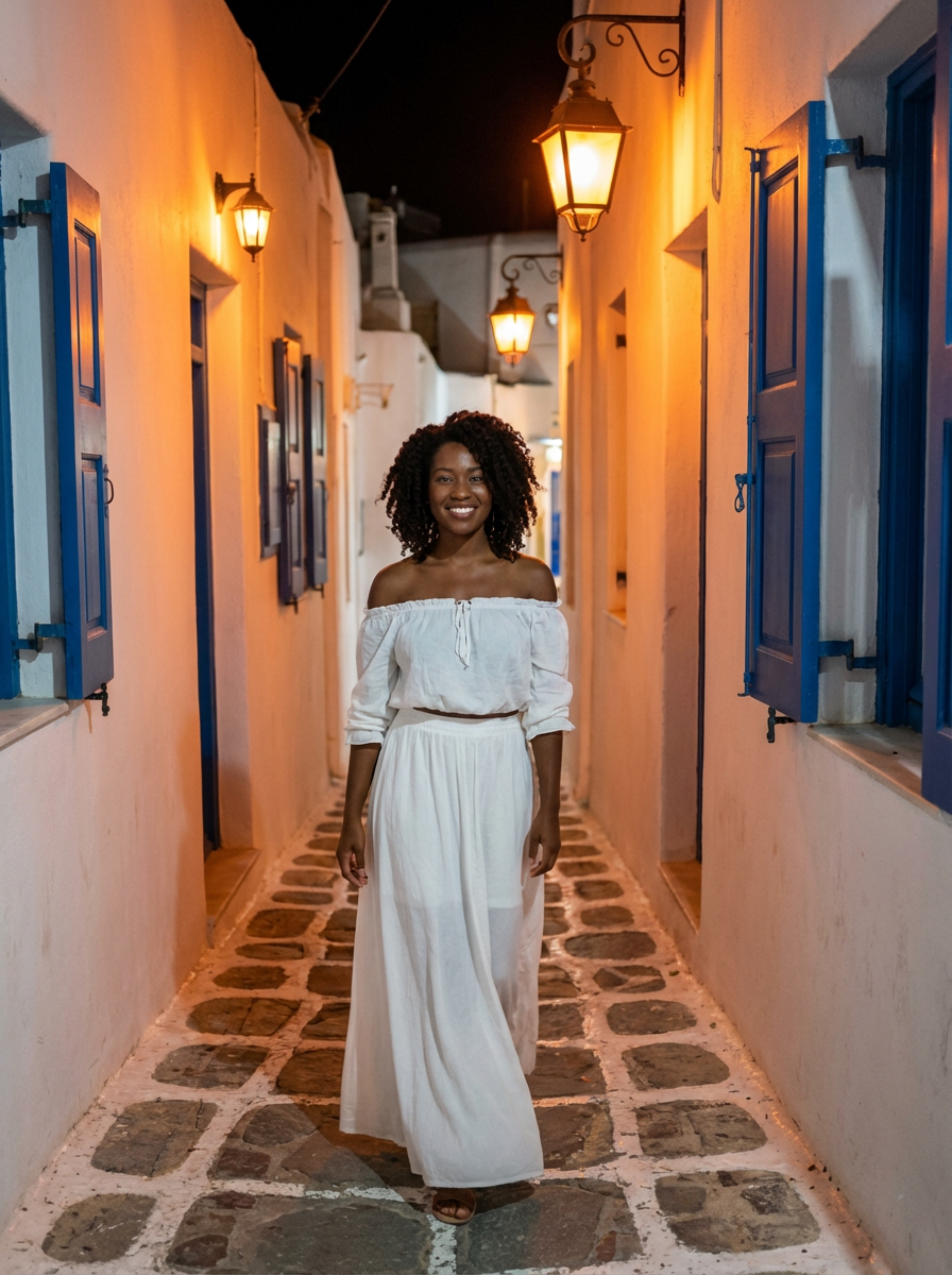 model strolling through narrow Mykonos streets, wearing a white off-shoulder top with flowing skirt , warm lantern lights illuminating the path