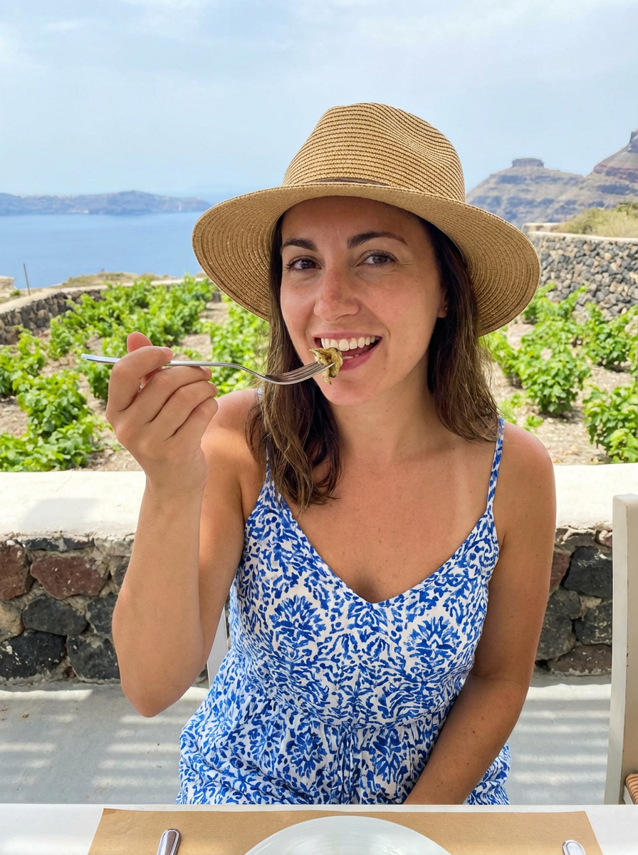 model tasting food at a Santorini farm, wearing a sophisticated summer dress with sun hat , rows of grapevines with sea views