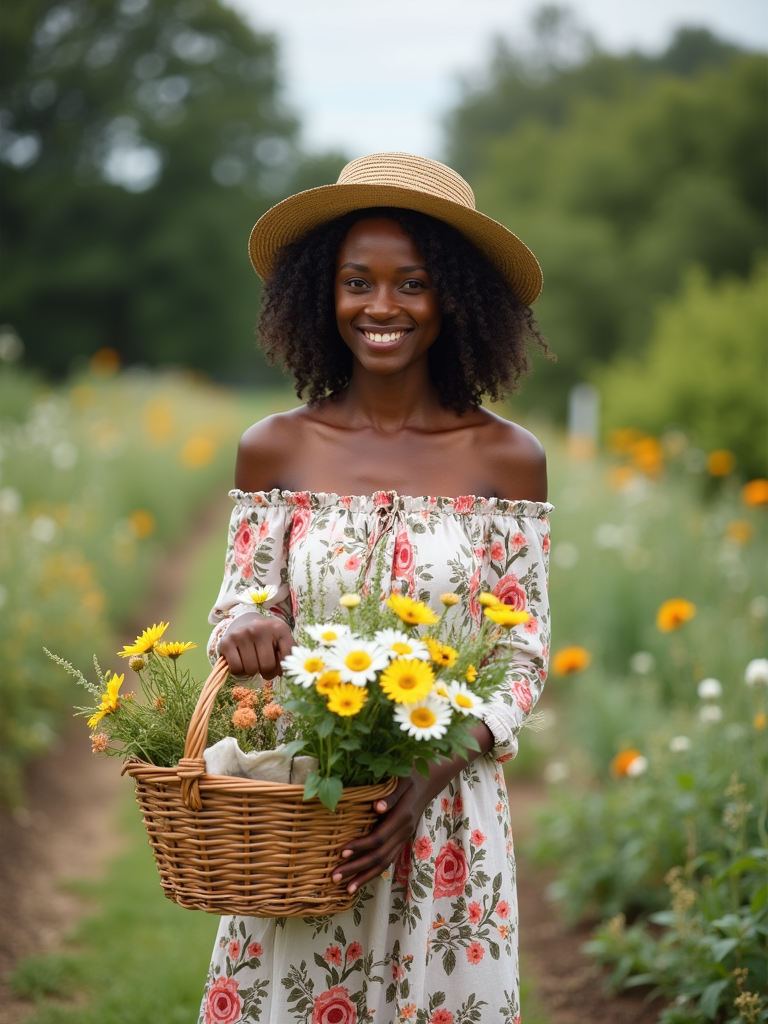 model tending to a garden in the countryside during the day, wearing a long-sleeved floral off-the-shoulder dress, a sunhat, and holding a basket of freshly picked flowers