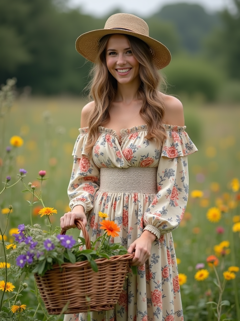 model tending to a garden in the countryside during the day, wearing a long-sleeved floral off-the-shoulder dress, a sunhat, and holding a basket of freshly picked flowers