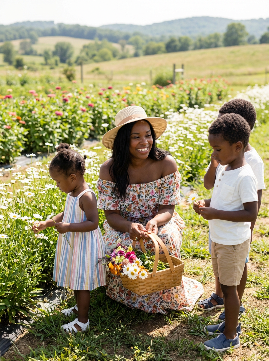 model tending to a garden in the countryside during the day with her three children picking flowers, wearing a long-sleeved floral off-the-shoulder dress, a sunhat, and holding a basket of freshly picked flowers