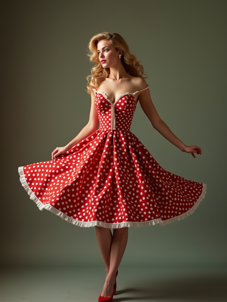 model twirling in a retro swing dress blown up Marilyn-style, revealing stockings and panties , on a faux pin-up calendar set