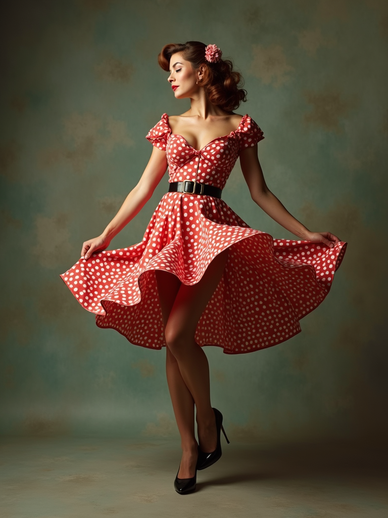 model twirling in a retro swing dress blown up Marilyn-style, revealing stockings and panties , on a faux pin-up calendar set