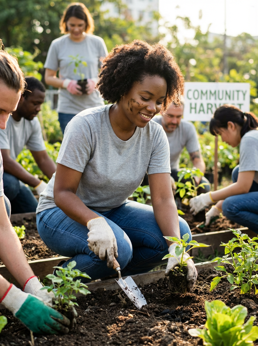 model volunteering or community activity, kind-hearted personality, casual helpful setting