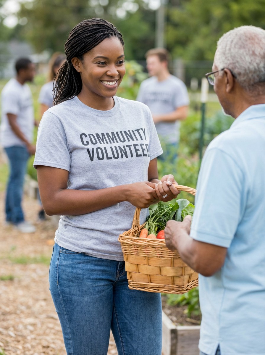 model volunteering or community activity, kind-hearted personality, casual helpful setting