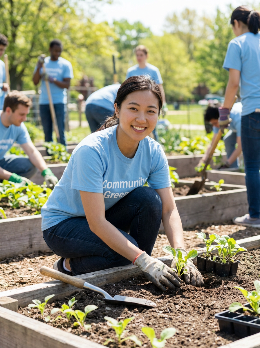 model volunteering or community activity, kind-hearted personality, casual helpful setting