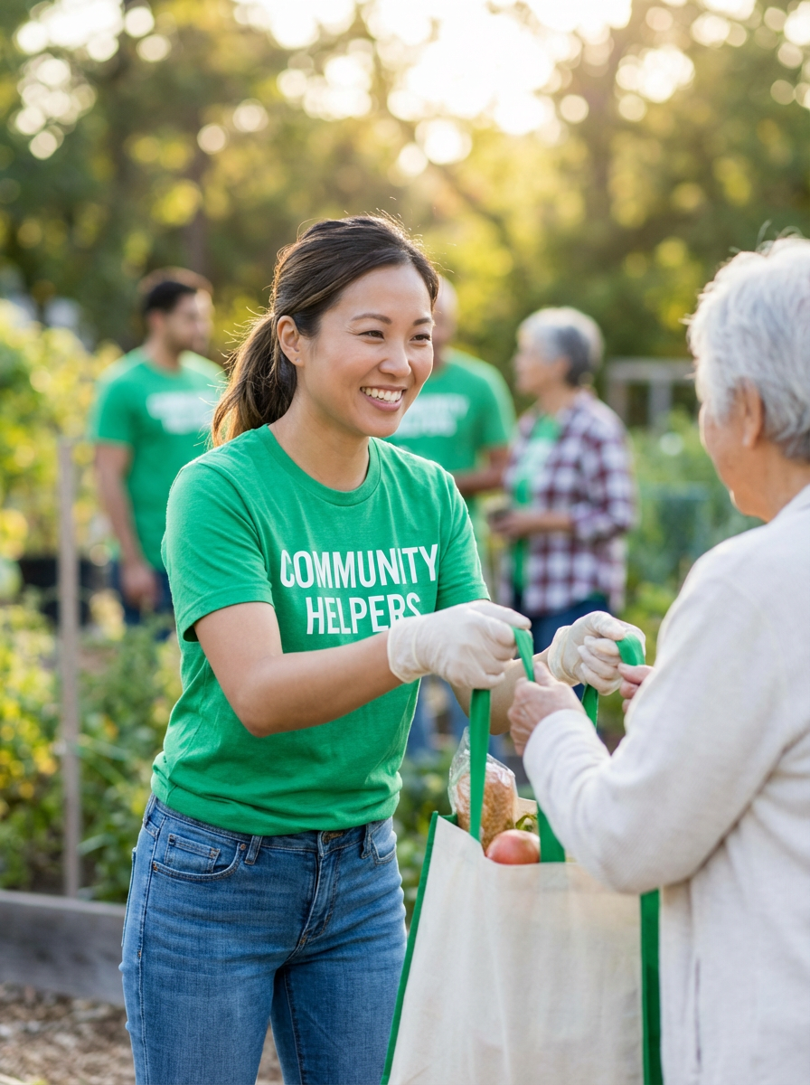 model volunteering or community activity, kind-hearted personality, casual helpful setting