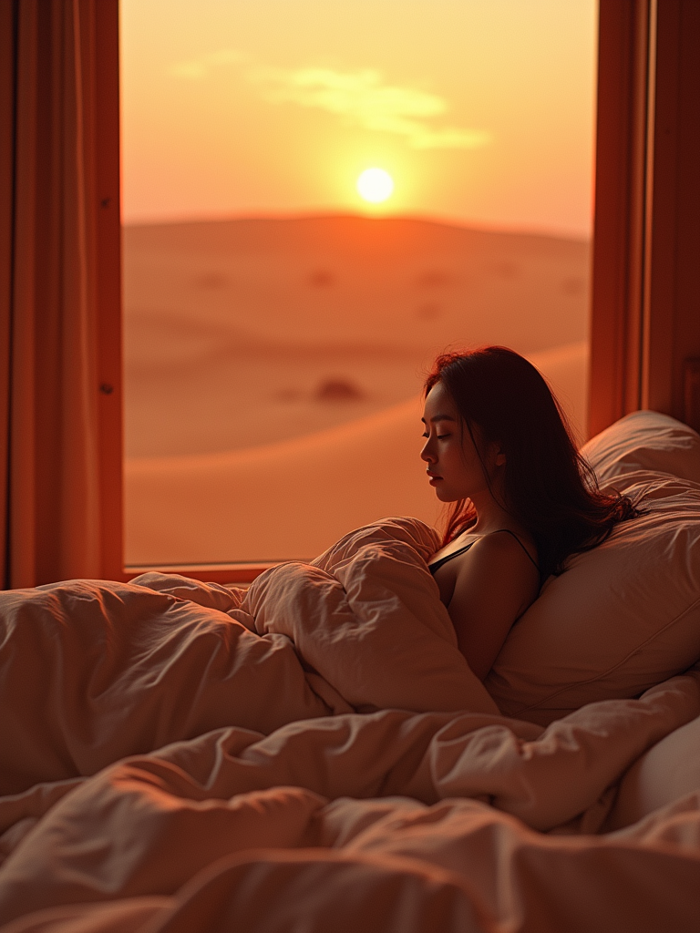 model waking up in bed on Mars at sunrise covered in duvet. Mars red dunes is visible in big windows.