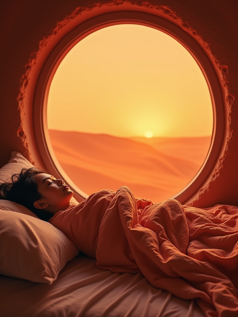 model waking up in bed on Mars at sunrise covered in duvet. Mars red dunes is visible in big windows.
