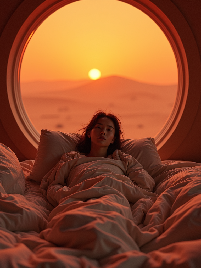model waking up in bed on Mars at sunrise covered in duvet. Mars red dunes is visible in big windows.