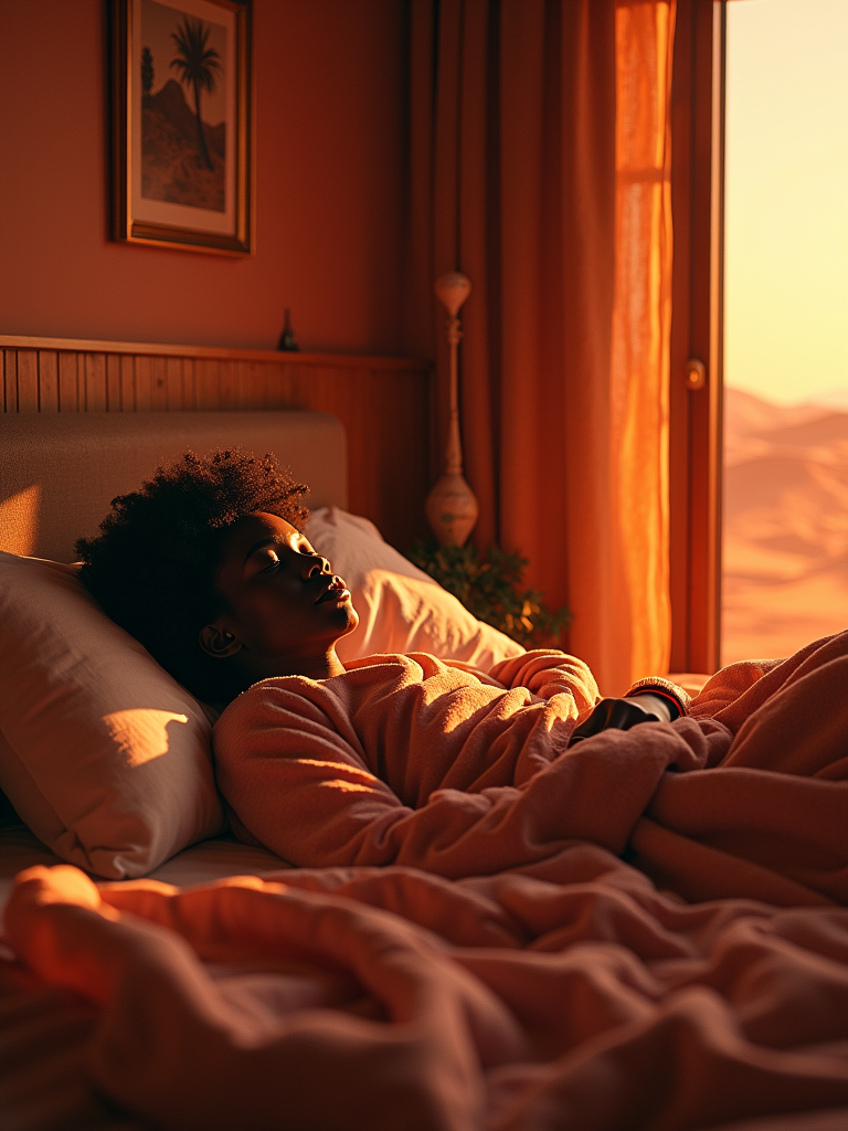 model waking up in bed on Mars at sunrise covered in duvet. Mars red dunes is visible in big windows.
