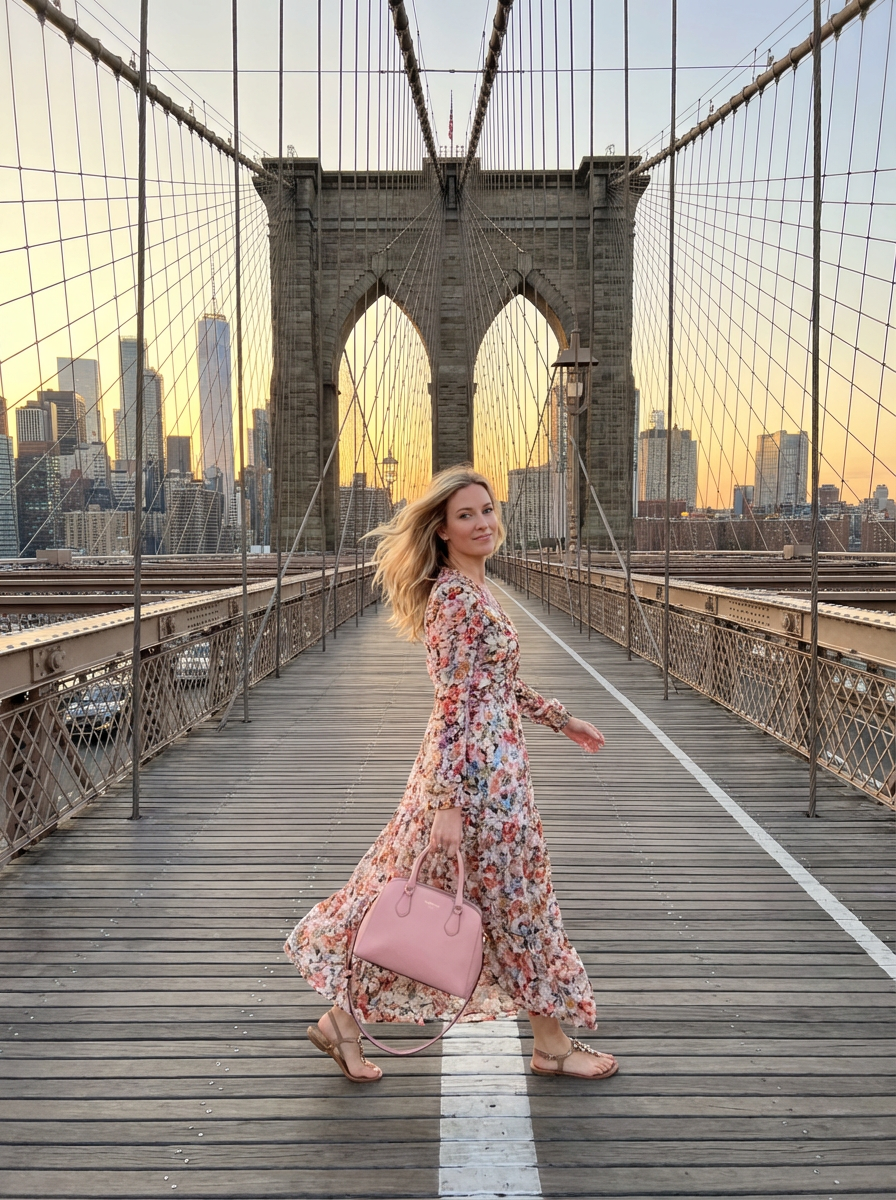 model walking across Brooklyn Bridge, Manhattan skyline behind, flowing dress in wind , golden hour