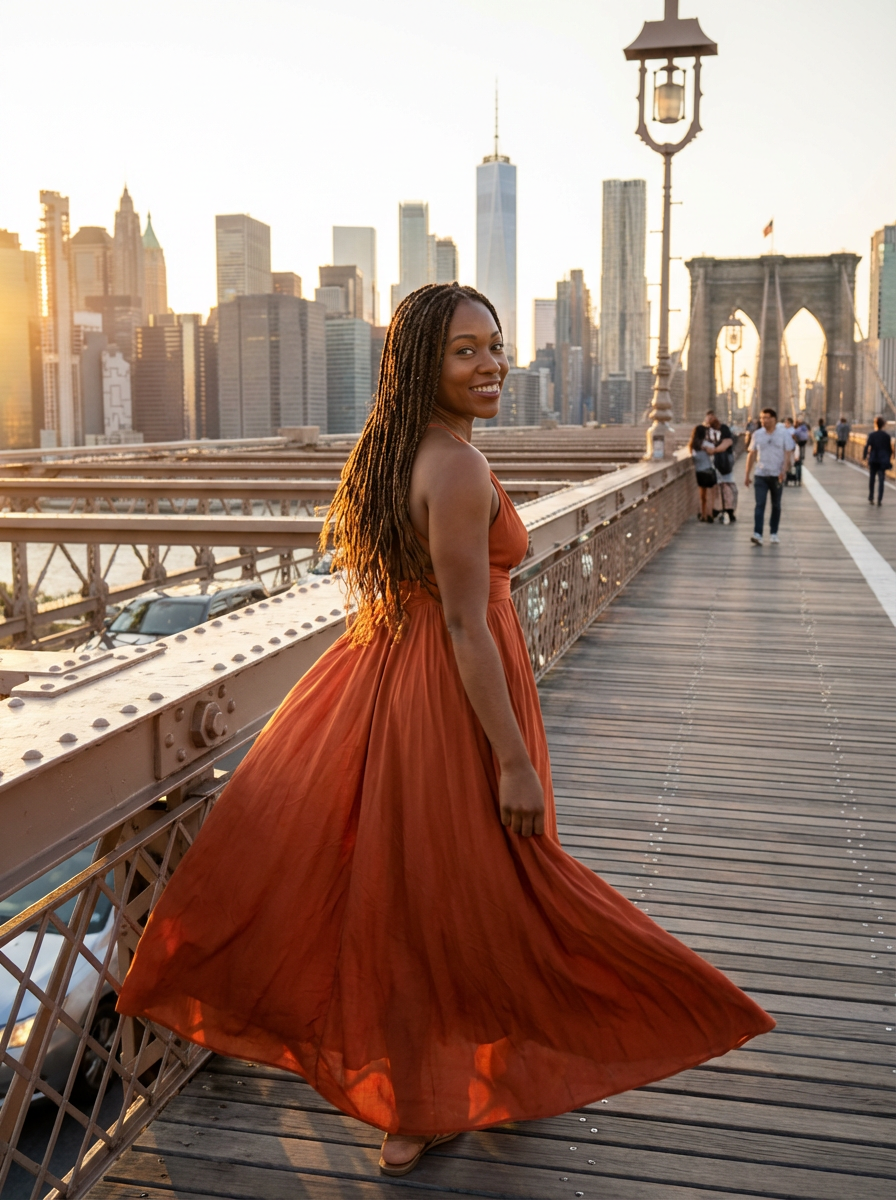model walking across Brooklyn Bridge, Manhattan skyline behind, flowing dress in wind , golden hour
