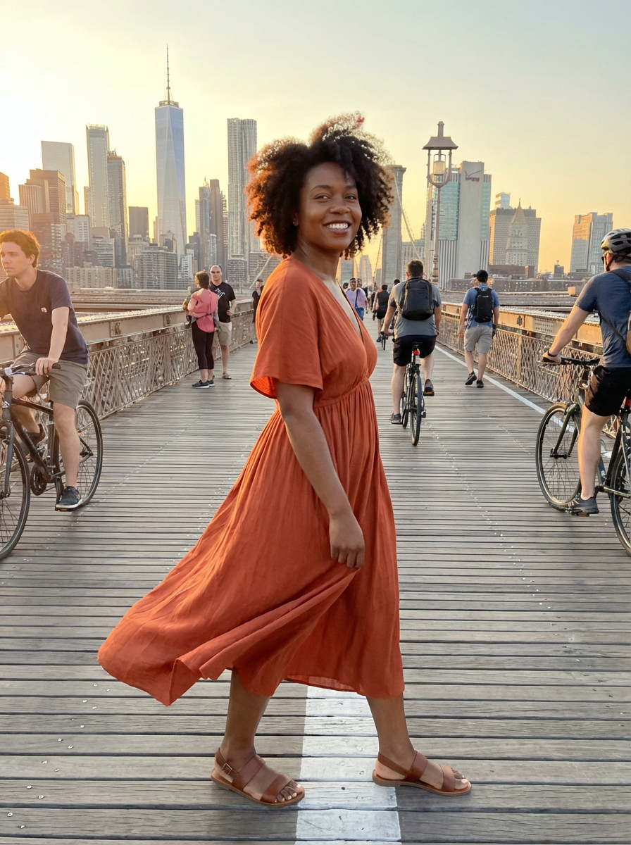 model walking across Brooklyn Bridge, Manhattan skyline behind, flowing dress in wind , golden hour