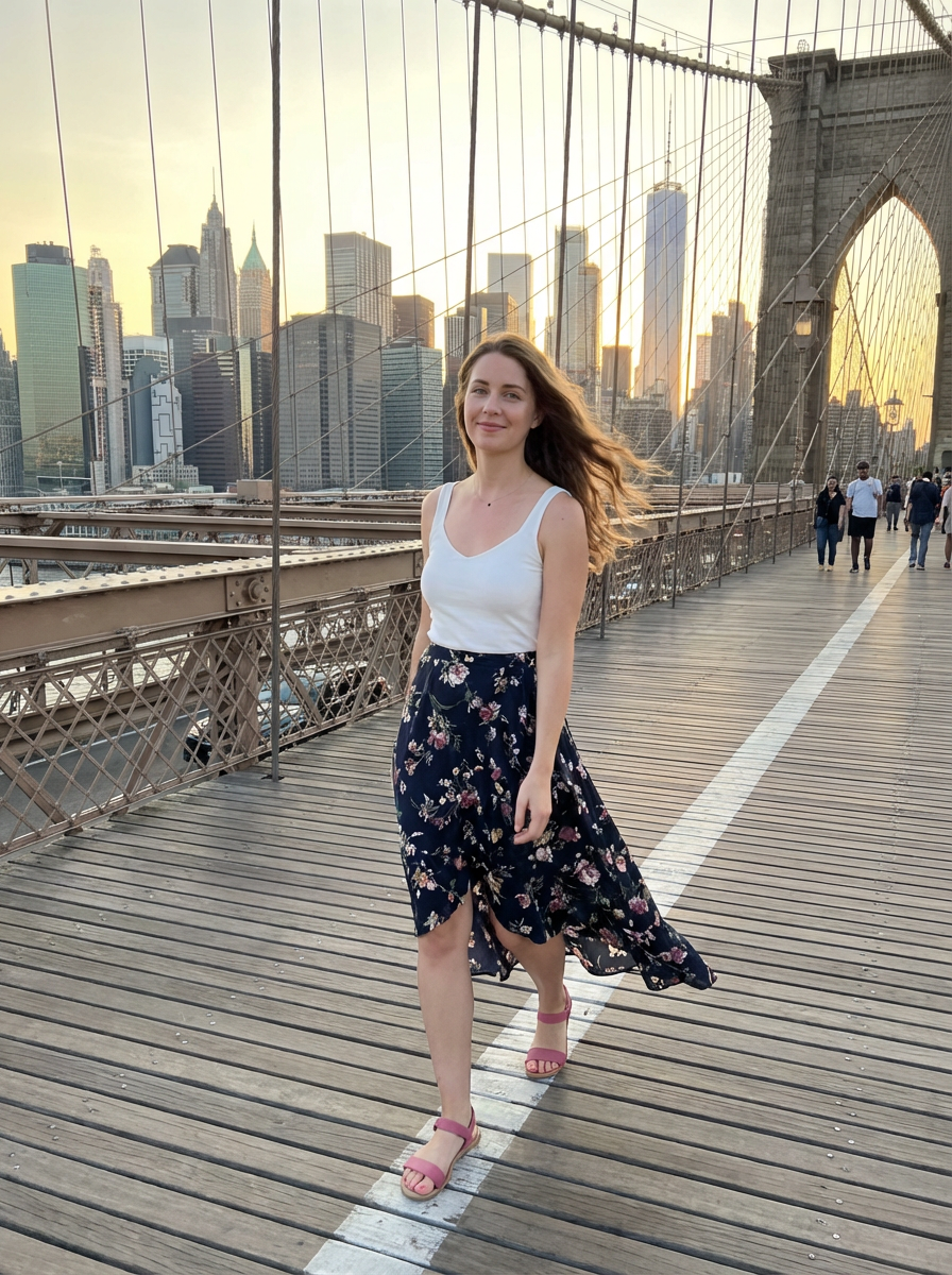 model walking across Brooklyn Bridge, Manhattan skyline behind, flowing dress in wind , golden hour
