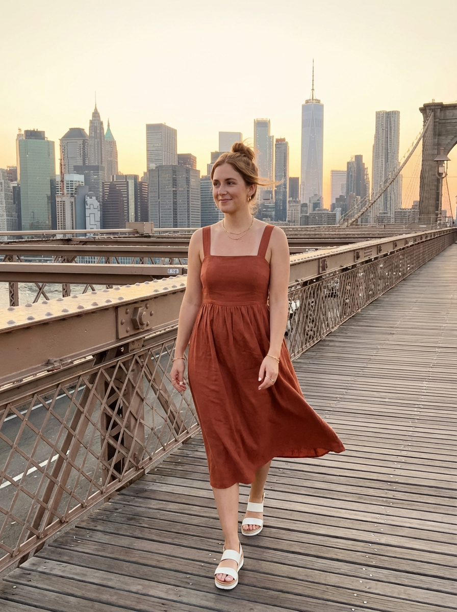 model walking across Brooklyn Bridge, Manhattan skyline behind, flowing dress in wind , golden hour