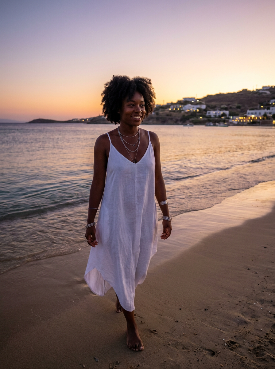 model walking along Ornos Beach at twilight, wearing a white beach dress with silver accessories , warm evening atmosphere