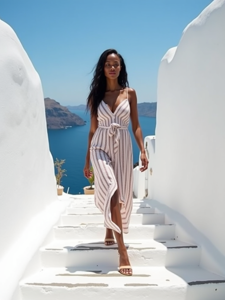 model walking down the white steps of Fira, wearing a breezy summer dress with sandals , whitewashed buildings and blue sea views
