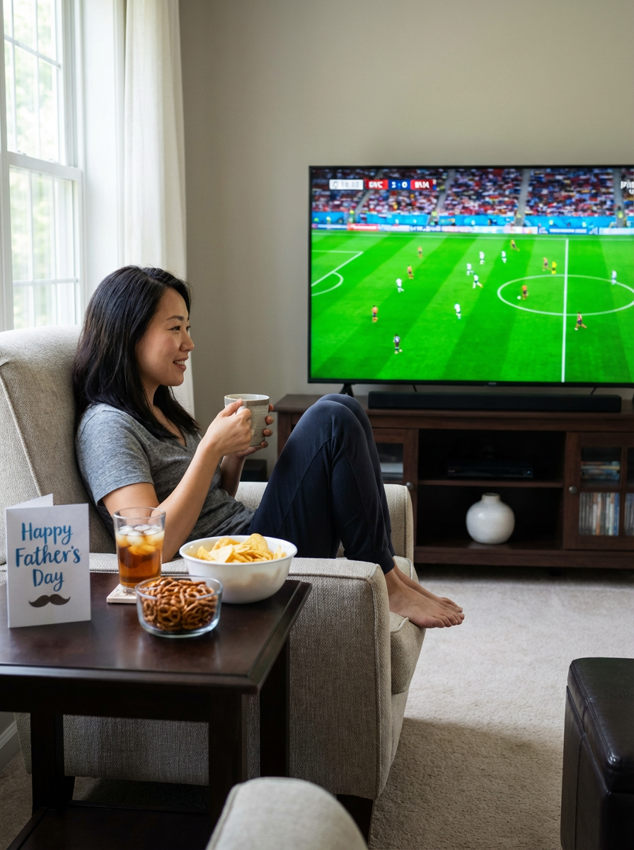 model watching sports on TV, Fathers Day relaxation, comfortable home setting, snacks and drinks