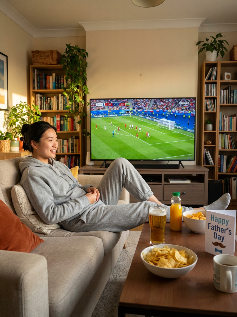 model watching sports on TV, Fathers Day relaxation, comfortable home setting, snacks and drinks