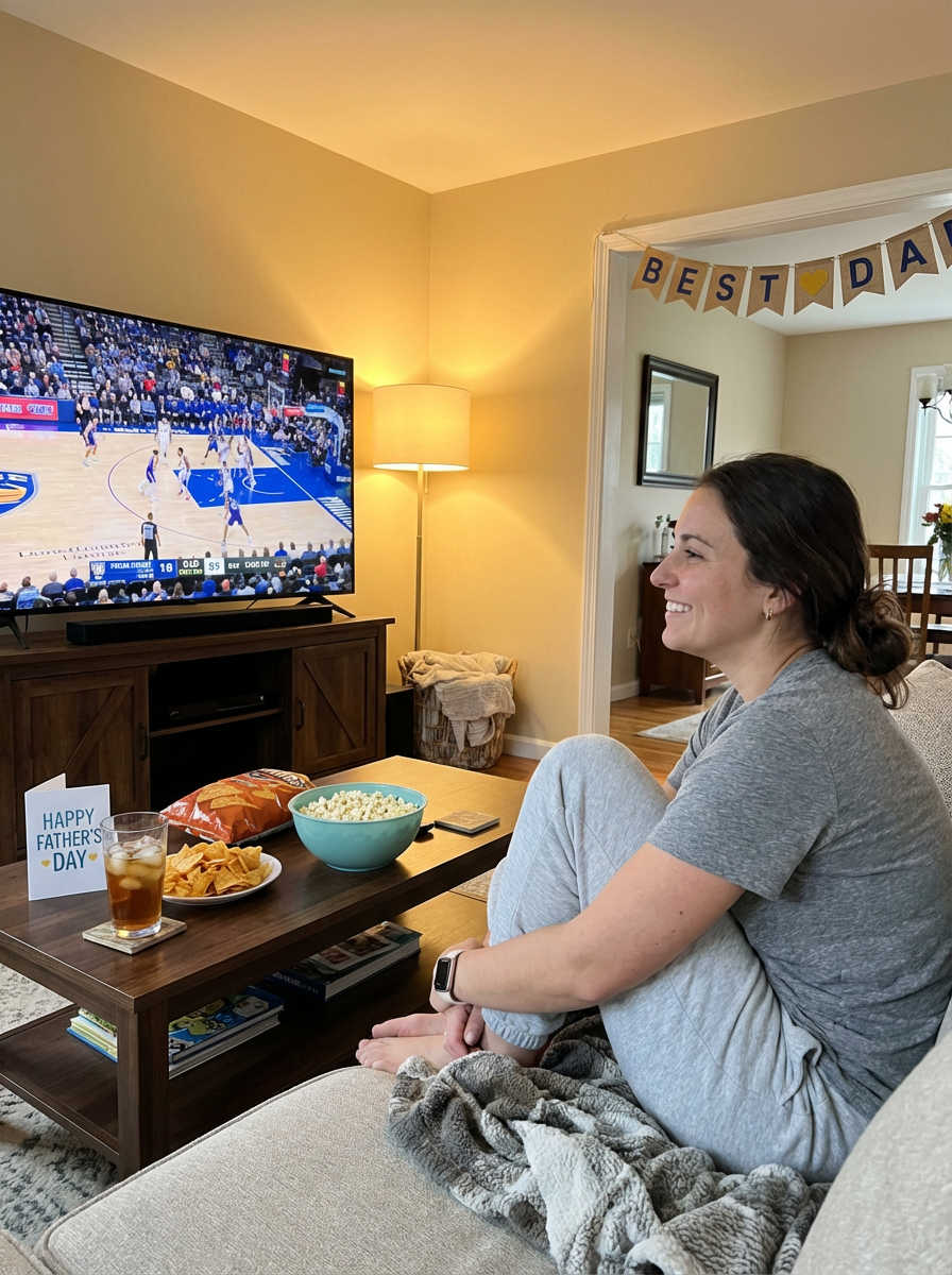 model watching sports on TV, Fathers Day relaxation, comfortable home setting, snacks and drinks