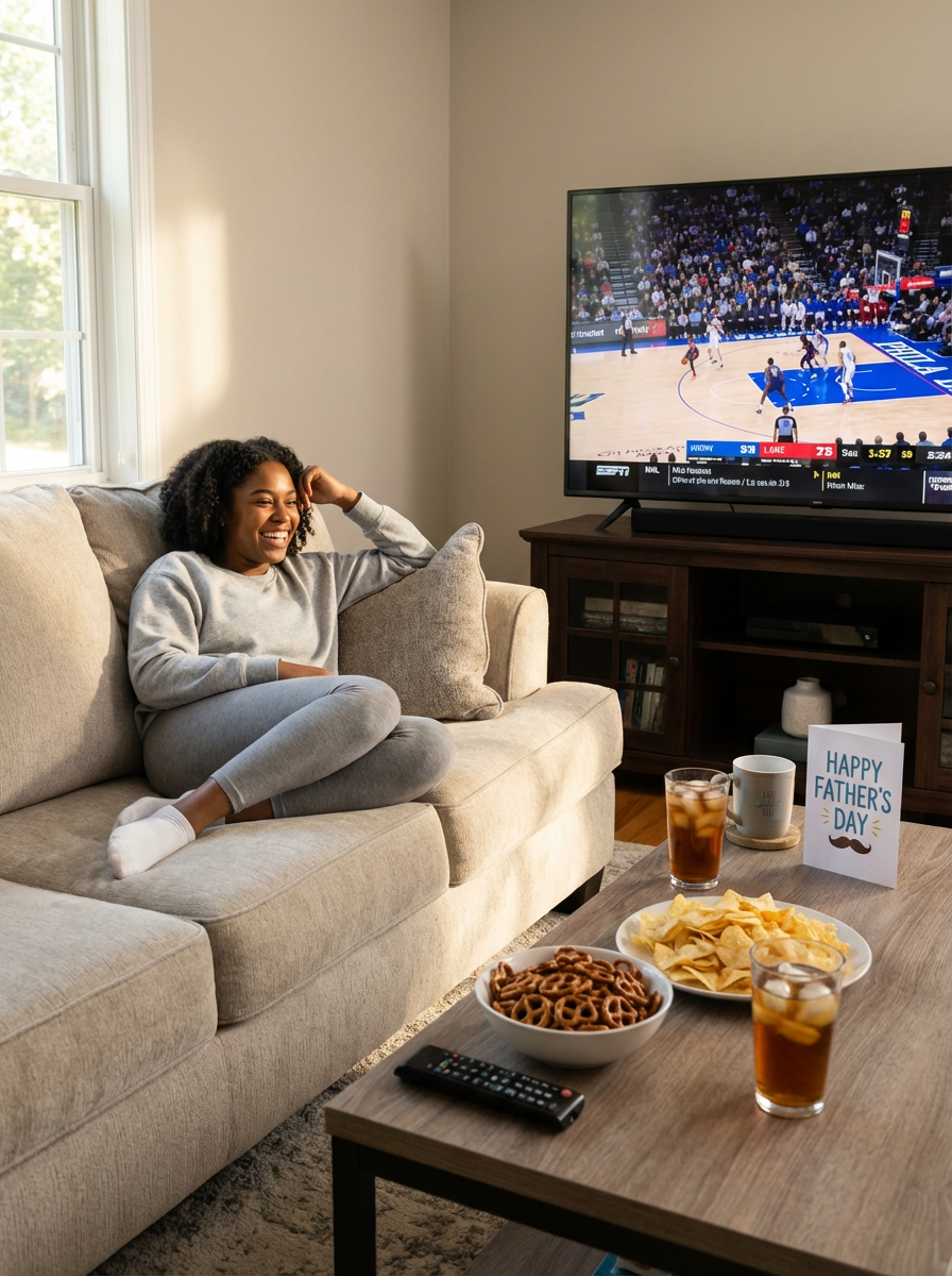 model watching sports on TV, Fathers Day relaxation, comfortable home setting, snacks and drinks