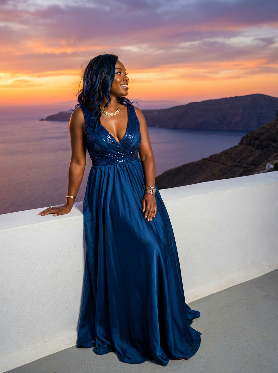 model watching sunset in Imerovigli, wearing a glamorous evening outfit with flowing elements , famous Santorini sunset colors