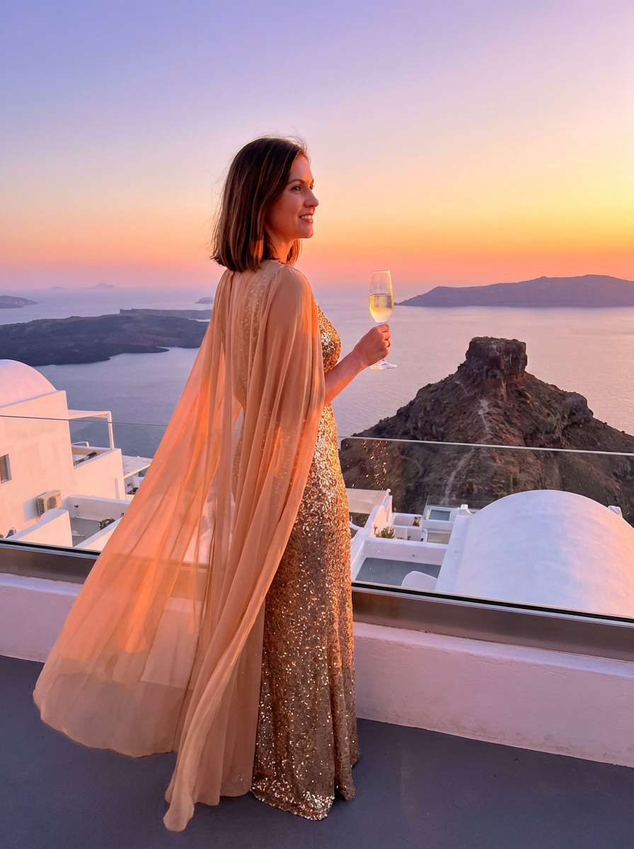 model watching sunset in Imerovigli, wearing a glamorous evening outfit with flowing elements , famous Santorini sunset colors