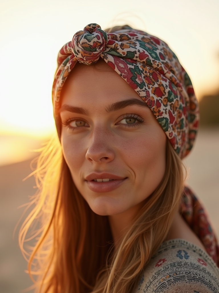 model wearing a bohemian-style printed head scarf fully covering the hair with a knot at the nape, with minimal face makeup , at a beachside location at golden hour