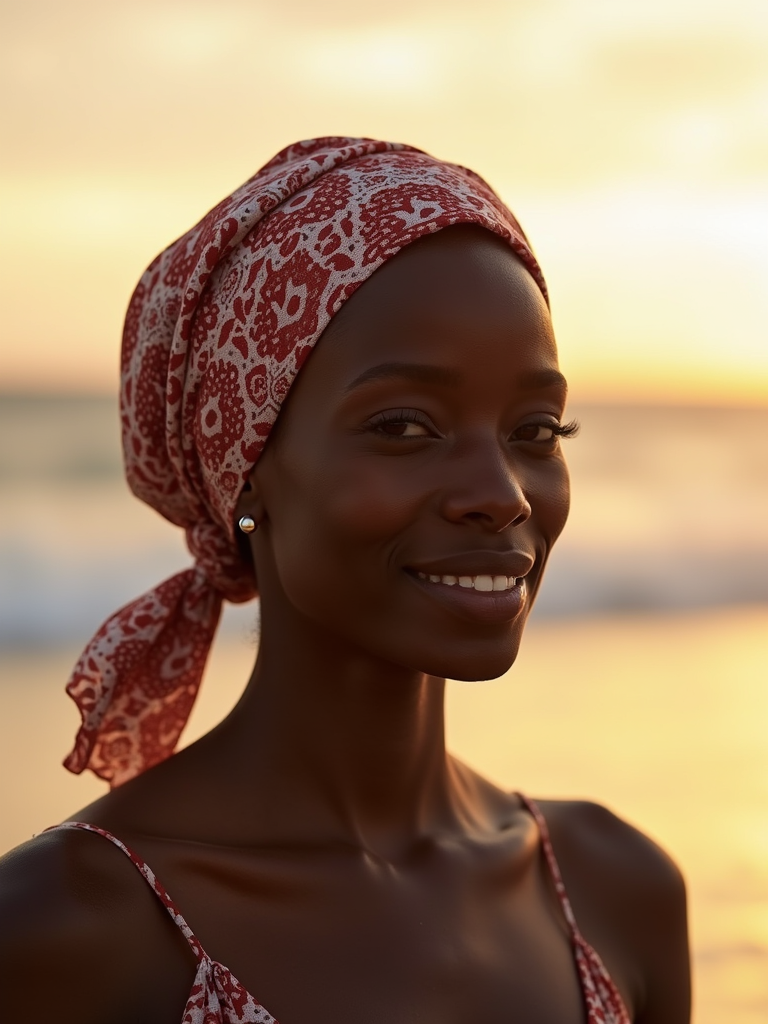 model wearing a bohemian-style printed head scarf fully covering the hair with a knot at the nape, with minimal face makeup , at a beachside location at golden hour