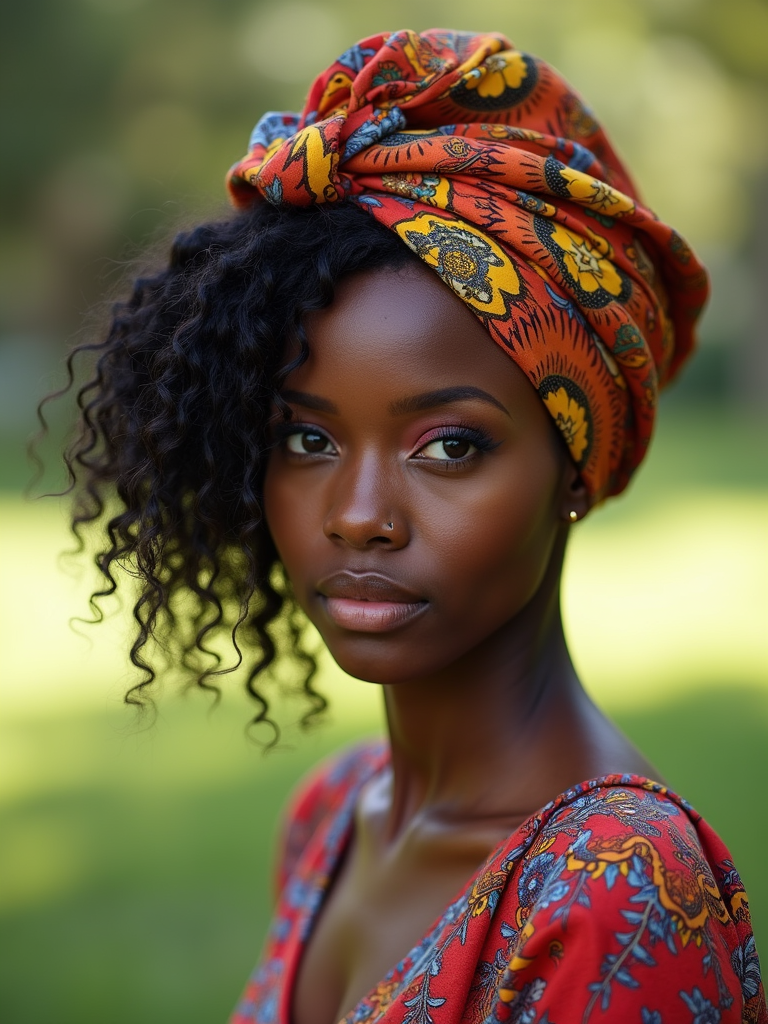 model wearing a colorful silk hair scarf fully covering the hair in a traditional wrapped style, with face-framing wisps , natural outdoor lighting in a park setting