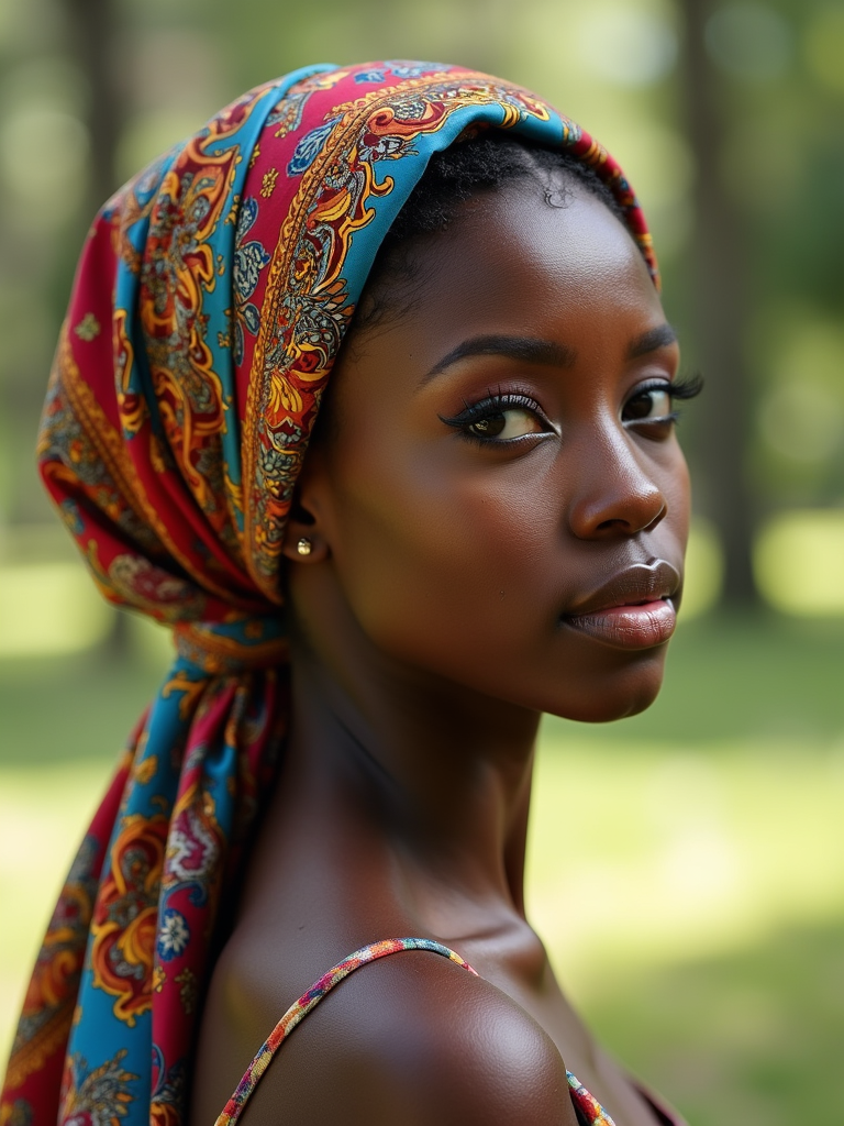 model wearing a colorful silk hair scarf fully covering the hair in a traditional wrapped style, with face-framing wisps , natural outdoor lighting in a park setting
