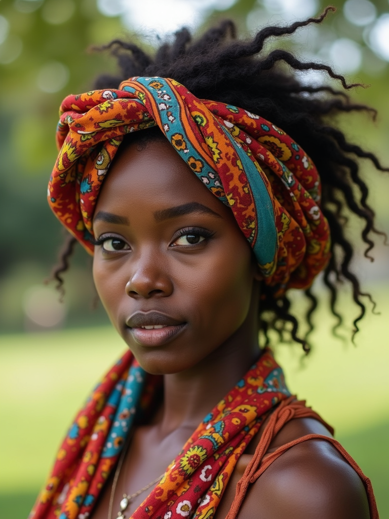 model wearing a colorful silk hair scarf fully covering the hair in a traditional wrapped style, with face-framing wisps , natural outdoor lighting in a park setting